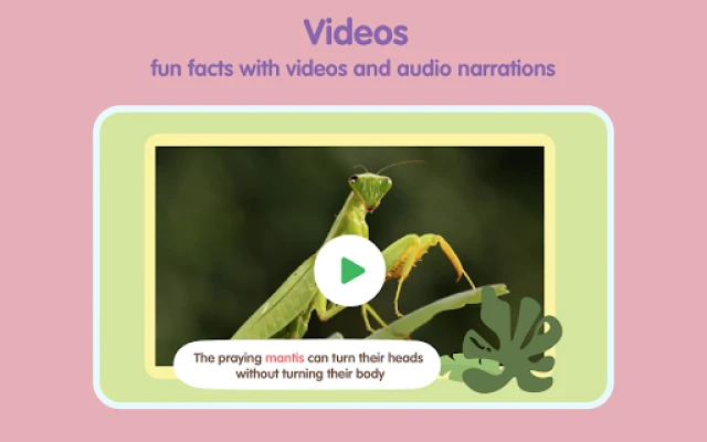 **Bugzzy एक्सप्लोरर** में, बच्चे सामान्य ज्ञान क्विज़ के साथ अपने ज्ञान की परीक्षा ले सकते हैं और विभिन्न प्रकार के कीड़ों वाली पहेलियाँ सुलझा सकते हैं। ये गतिविधियाँ न केवल मनोरंजन करती हैं, बल्कि स्मृति और समस्या-समाधान कौशल को भी बढ़ाती हैं, जो पूर्वस्कूली शिक्षा के लिए आवश्यक हैं। ऐप में इंटरैक्टिव गेम भी शामिल हैं जो कीड़ों के नामों की वर्तनी और उनके सही उच्चारण को सुदृढ़ करते हैं, जिससे बच्चों को शब्दावली बनाने और भाषा कौशल विकसित करने में मदद मिलती है। हमारे आकर्षक शैक्षणिक वीडियो के साथ कीड़ों के साम्राज्य को जीवंत होते देखें, जहाँ मनमोहक एनिमेशन और सुनाए गए पाठ हर अवधारणा को समझने योग्य बनाते हैं।
