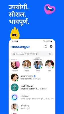Messenger एक मुफ़्त मैसेजिंग ऐप है जो आपको दोस्तों और परिवार से जोड़े रखता है। अपनी रुचियों को समान विचारधारा वाले लोगों के साथ जानें, अपनी कम्युनिटी बनाएँ और शब्दों के बिना भी खुद को व्यक्त करें। कहीं भी, किसी से भी बात करें।